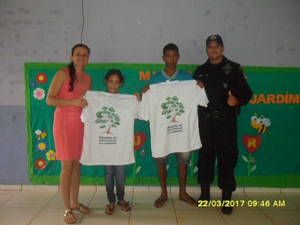 Ao final da palestra, foi realizado um quiz de perguntas e respostas onde os ganhadores foram presenteados com uma camiseta sobre o meio ambiente, camisetas que também faz parte do material paradidático idealizado pela Prt. Escolar e distribuído nas Escolas de Ariquemes/RO.
