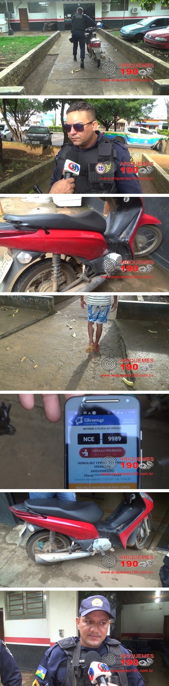 Por volta das 18 horas de segunda-feira (27/03), o Cabo Oliveira e o PM Henrique realizavam patrulhamento ostensivo pela Rua dos Topázios, no Setor Parque das Gemas, quando avistaram um indivíduo conduzindo uma motoneta da marca Honda, modelo Biz de cor vermelha, placa NCE-9989/Ariquemes-RO. O condutor ao perceber que a viatura se aproximava, jogou o veículo ao solo e colocou as mãos na cabeça. A guarnição então constatou que se tratava de um menor de 15 anos, que disse ter comprado a Biz com restrição de Roubo pela quantia de R$ 600,00 em dinheiro na Praça do Açaí, no Setor 02 de um elemento que ele não conhece. A avó do menor foi avisada e acompanhou o registro da ocorrência nº 46523/17, na Delegacia Geral, para as providências que o caso requer.