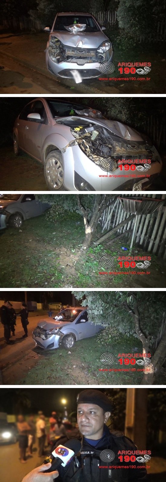 Por volta das 21 horas, desta terça-feira 28/03, a guarnição da Polícia Militar foi acionada a comparecer na Rua Vimbere no Setor 04 de Ariquemes, pois segundo informações, no local havia acontecido um acidente de trânsito. Imediatamente, a guarnição fez o deslocamento, sendo que ali chegando, os PM’s se depararam com um veículo da marca Ford, modelo Fiesta de cor prata com a frente destruída após colidir com uma árvore na calçada. Populares não souberam informar quem seria o condutor do veículo e no local ninguém se apresentou como sendo a vítima. Foram feitas as consultas veiculares e constatado que o carro não possuía nenhuma restrição. Diante do exposto, o carro foi deixado no local, para que o proprietário retire o mesmo.