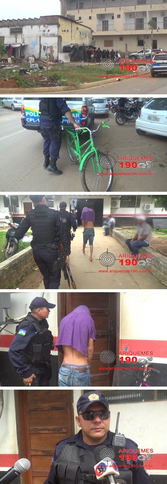 Na manhã desta terça-feira 30/05, a guarnição da Polícia Militar foi acionada a comparecer na Alameda entre a 1ª e 2ª Rua do Setor 02 de Ariquemes, onde elementos estavam realizando um furto em uma residência. De imediato, os Militares compareceram no local, onde ao chegar, os elementos ouviram a aproximação da viatura e se evadiram do local. Os PM’s foram rápidos e conseguiram deter um dos marginais. O elemento abandonou no local, uma bicicleta de cor verde, que segundo ele, é de sua propriedade. A guarnição realizou diligências nas proximidades, realizando abordagens nos usuários de drogas que frequentam o rebojo, contudo, os outros criminosos não foram localizados. Diante do exposto, o elemento que já possui passagem por roubo e por aliciamento de menor, foi conduzido a Delegacia de Polícia Civil de Ariquemes, onde foi registrado o Boletim de Ocorrência Policial (BOP), para a tomada das providências que o caso requer.