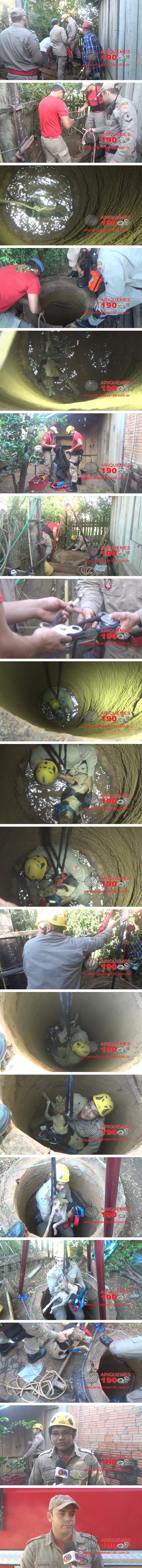 Na manhã desta quarta-feira 31/05, por volta das 7 horas, a guarnição do Corpo de Bombeiros foi acionada a comparecer na Rua Centauro no Bairro Rota do Sol em Ariquemes, pois segundo informações, um cachorro teria caído em um poço. Imediatamente, os Soldados Miranda e Purccino, comandados pelo Cabo R. Souza, compareceram no local onde constataram a veracidade da informação. Segundo o morador da residência, o cachorro denominado Tupã teria caído no poço durante a noite. A princípio, os Bombeiros tentaram puxar o animal, porém não foi possível, sendo necessário que o Bombeiro Miranda descesse no poço e retirasse o cachorro. Graças ao empenho de toda a equipe, o cachorro foi resgatado e devolvido aos proprietários. Em entrevista ao Programa Bronca da Pesada, o Cabo R. Souza, recomendou a população, que mantenha poços sempre fechados, pois desta vez foi um cachorro que caiu no local, contudo poderia ser uma criança ou até mesmo um adulto.