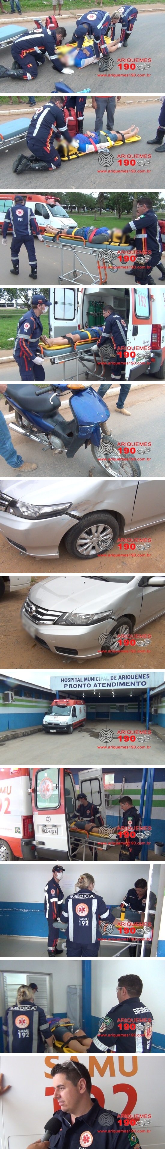 Mais um acidente de trânsito foi registrado em Ariquemes, desta vez, a colisão entre uma motoneta da marca Honda, modelo Biz de cor azul e um carro da marca Honda, modelo City de cor prata, aconteceu na Avenida Capitão Silvio coma Avenida Tancredo Neves. Por volta das 10 horas, desta quinta-feira 01/06, a equipe de socorro do Serviço de Atendimento Móvel de Urgência (SAMU), foi acionada a comparecer no endereço supracitado, sendo que ali chegando, os socorristas se depararam com uma mulher ferida, apresentando uma possível fratura no ombro, além de escoriações. A vítima relata que não lembra como aconteceu o acidente e que recorda apenas do momento em que sentiu o impacto do carro com a moto em seguida caiu ao solo. A condutora foi imobilizada e conduzida ao pronto socorro para receber atendimento médico especializado.