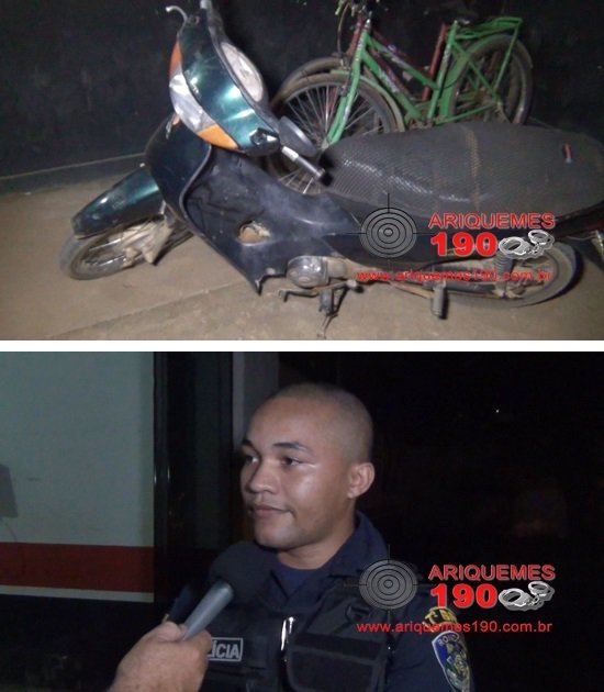Durante a noite desta sexta-feira 02/06, a guarnição da Patrulha Eco da Polícia Militar, realizava patrulhamento pela Avenida Cassimiro de Abreu, no Setor Colonial, em Ariquemes, quando em dado momento, os Soldados Izaque, Genilson e Soares, avistaram uma motoneta da marca Honda, modelo Biz de cor verde, sendo conduzida por um elemento suspeito. Os Policiais realizaram a abordagem, sendo que em consulta veicular, foi constatado que a motoneta havia sido furtada no Jardim Feliz Cidade, em uma residência onde uma mulher teria executado o marido com facada no peito. Ao ser informado da restrição, o marginal assumiu que furtou o veículo. Diante do exposto, a moto foi apresentada na Delegacia de Polícia Civil de Ariquemes, onde foi registrado o Boletim de Ocorrência Policial (BOP), sob n°87472/17, para que posteriormente, a moto seja devolvida a proprietária.