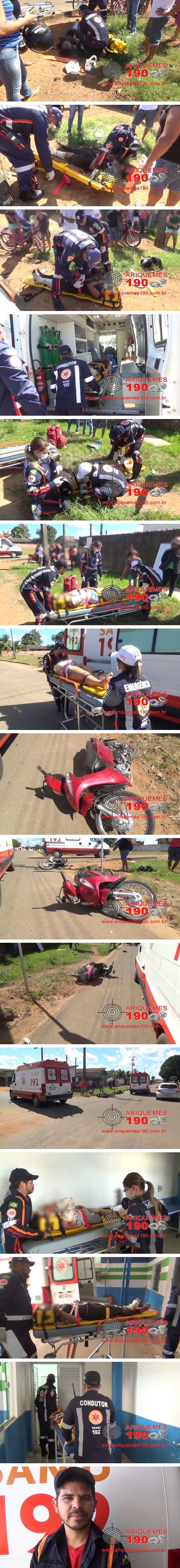No início da tarde desta terça-feira 13/05, a equipe de socorro do Serviço de Atendimento Móvel de Urgência (SAMU), foi acionada a comparecer no cruzamento da Rua Garça com Rua Gavião no Bairro Jardim das Palmeiras em Ariquemes, onde havia acontecido um acidente de trânsito. Chegando no local, os socorristas se depararam com duas vítimas caídas ao solo, sendo que uma delas apresentava possíveis fraturas. A Unidade de Suporte Básico (USB) do SAMU composta pelo Técnico em enfermagem Wesley e Condutor Adjauma foram os primeiros a chegar e devido ao fato de ter duas vítimas foi acionada a equipe da Unidade de Suporte Avançado (USA), composta pela Doutora Evelyn, Enfermeira Deusa e Condutor Socorrista Marquinhos que rapidamente chegaram e atenderam a outra vítima. A condutora da motocicleta da marca Honda, modelo Titan de cor preta apresentava suspeita de fratura na tíbia e clavícula, já a condutor da Biz apresentava apenas escoriações. Populares informaram que as motos colidiram em um cruzamento. Ambas as vítimas foram conduzidas ao pronto socorro para receber atendimento médico especializado.