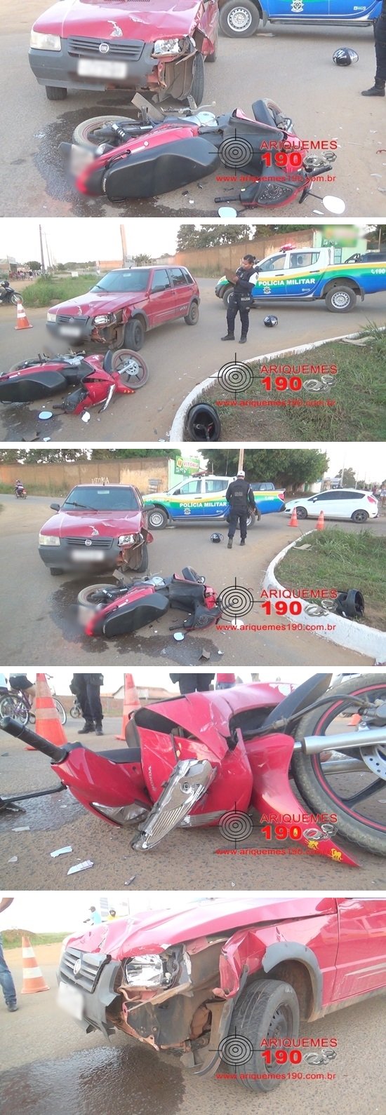 Na tarde desta quinta-feira 15/06, a guarnição da Patrulha de Trânsito (PTran), composta pelos Soldados A. Miranda, Santos Pena, comandada pelo Cabo Abramovsky, foi acionada a comparecer no cruzamento das Avenidas Machadinho, com Perimetral Leste, onde havia acontecido um acidente de trânsito. Ali chegando, os Militares se depararam com um acidente envolvendo uma motoneta da marca Honda, modelo Biz de cor vermelha e um carro da marca Fiat, modelo Uno também de cor vermelha. Ambos os veículos passavam pelo cruzamento, quando houve a colisão. Somente a passageira da motoneta ficou ferida. Devido ao fato de as ambulâncias do SAMU e Bombeiros estarem ocupadas, os Policiais conduziram a vítima ao pronto socorro para receber atendimento médico especializado.