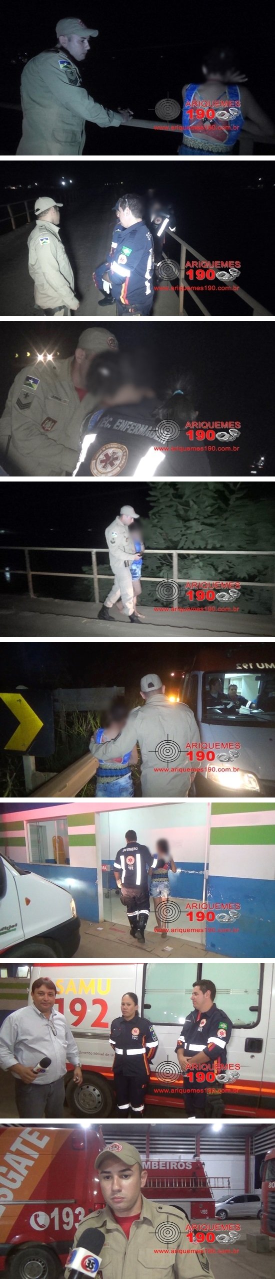 Durante a noite desta quinta-feira 15/06, as equipes de socorro do Corpo de Bombeiros e do Serviço de Atendimento Móvel de Urgência (SAMU), foram acionadas a comparecer na ponte do Rio Jamari, onde havia uma moça que pretendia se jogar da ponte. Imediatamente, os socorristas compareceram no local, onde constataram a veracidade da informação, se deparando com a jovem encostada no corrimão da ponte. A moça relatou que fazia tratamento para depressão, vem passando por problemas familiares e durante aquela noite, saiu de sua residência no Setor 12 e foi a pé até a ponte onde queria por fim a sua vida. Em um trabalho conjunto, os Bombeiros e socorristas do SAMU, ganharam a confiança da mulher e convenceram a mesma para não se jogar. Em seguida, a moça foi atendida na ambulância do SAMU e conduzida ao pronto socorro para receber atendimento médico.