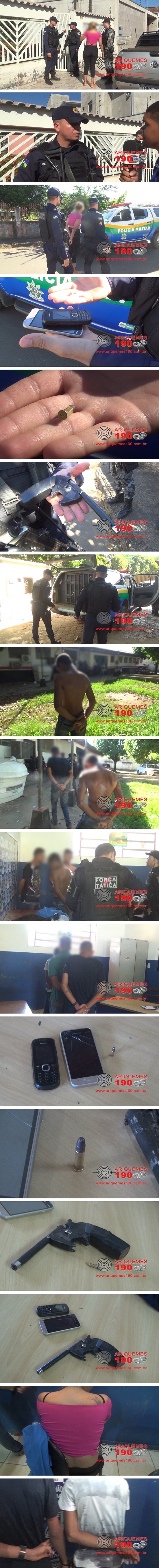 Na tarde desta terça-feira 20/06, a guarnição da Polícia Militar foi acionada a comparecer em uma Escola Estadual localizada no Setor 03 de Ariquemes, onde duas alunas haviam sido roubadas. Durante o deslocamento, os Militares foram informados que os suspeitos estavam sendo seguidos por dois cidadãos, sendo que para despistar um deles, um dos adolescentes apontou uma arma. Um dos cidadãos visualizou uma residência no Setor 01 onde o grupo havia adentrado. Rapidamente, os Militares foram até a casa, onde entraram em contato com os moradores e localizaram os três menores e uma mulher que haviam realizado o roubo. Na casa também foram encontrados os celulares roubados, um simulacro de arma de fogo e uma munição calibre .22. Diante dos fatos, os infratores foram conduzidos a Delegacia de Polícia Civil de Ariquemes, onde foi registrado o Boletim de Ocorrência Policial (BOP), para a tomada das providências que o caso requer. Mais informações em instantes, ou no Programa Bronca da Pesada desta quarta-feira 21/06, a partir das 11 horas, com reprise as 20 horas, pela TV do Povo Canal 35 filiada Rede Meio Norte.