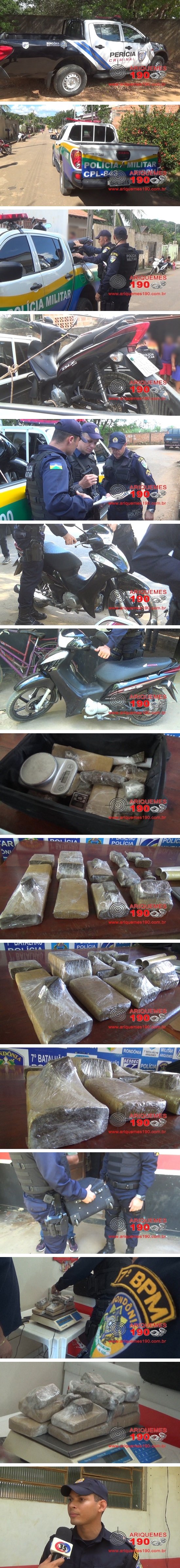Por volta das 14 horas, desta quinta-feira 22/06, a guarnição da Patrulha Charlie da Polícia Militar realizava patrulhamento pela 4ª Rua do Setor 09 de Ariquemes, quando em dado momento, os Militares foram informados que na Rua Palmas havia uma motoneta furtada e no local funcionaria um comércio de drogas. Imediatamente, a guarnição compareceu no local, onde em contato com a proprietária da residência a mesma autorizou a entrada dos Militares. No momento que a guarnição averiguava a casa, os PM’s foram informados que nos fundos do quintal havia outra residência onde morava um casal e que havia uma moto no local. Os Militares encontraram no quintal, uma motoneta da marca Honda, modelo Biz de cor preta, placa NCZ-7043. Foi feita a consulta veicular, e constatado que o veículo possui restrição de roubo/furto. A mulher relatou que a casa foi cedida para sua neta morar junto com o esposo e pediu para que se a guarnição achasse necessário, averiguasse se havia algo ilícito no local. Os Militares fizeram buscas na residência onde encontraram uma mala com uma balança de precisão e papel alumínio. Dentro da geladeira, também foram encontradas substâncias entorpecentes embaladas com fita crepe. A Polícia Técnico-Científica (POLITEC) compareceu no local, onde realizou a perícia. Diante dos fatos, a moto e a droga apreendida foram apresentadas na Delegacia de Polícia Civil de Ariquemes, onde foi constatado que a substância pela 4,850KG. Foi registrado o Boletim de Ocorrência Policial (BOP), sob n°99687/2017, para a tomada das providências.