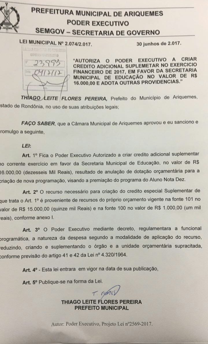 Prefeito Thiago Flores AUTORIZA liberação de recurso para Premiação da 2° Edição do ALUNO NOTA 10, projeto de autoria do vereador Amalec da Costa (PSDB).