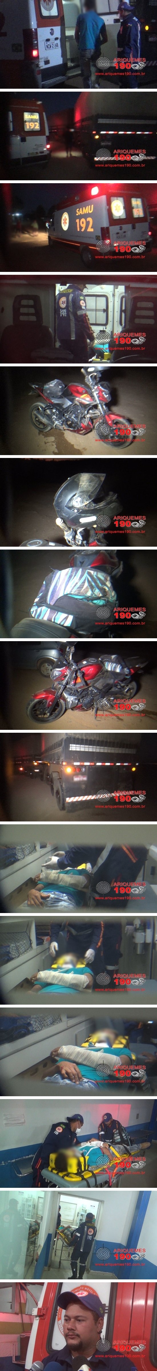 No início da noite desta segunda-feira 10/07, a equipe de socorro do Serviço de Atendimento Móvel de Urgência (SAMU), foi acionada a comparecer no Km-487 da BR-364 de Ariquemes sentido Jaru, onde havia acontecido um acidente de trânsito. Chegando no local, os socorristas foram informados pelo motociclista, que o mesmo seguia pela BR, quando o condutor da carreta sinalizou e adentrou o acostamento. O motociclista perdeu o controle da direção e veio a cair ao solo. O Técnico em Enfermagem Wesley e o condutor Ailton constataram uma fratura na clavícula e outra no braço esquerdo. A vítima foi colocada na ambulância, em seguida foi imobilizada e conduzida ao pronto socorro para receber atendimento médico especializado.