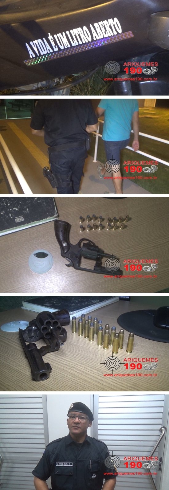 Durante a noite deste sábado 15/07, a guarnição de serviço, Comandada pelo Sargento Carlos com apoio das Guarnições do Distrito de Bom Futuro realizavam abordagens no município, quando os Militares avistaram uma motoneta da marca Honda, modelo Pop de cor preta, com metade da placa. Ao ser realizada a consulta veicular, foi constatado que a moto possui restrição de roubo/furto. O condutor da moto relatou que não sabia da restrição e contou que comprou a moto para trabalhar. Durante a mesma operação, os Militares abordaram um suspeito na Avenida Jorge Teixeira, sendo que foi com o homem, foi encontrada uma arma de fogo do tipo revólver calibre .38, com 6 munições intactas. No bolso do indivíduo foram encontradas mais 9 munições do mesmo calibre. Diante dos fatos, a moto, o receptador e o infrator com porte ilegal de arma de fogo, foram conduzidos a Unidade Integrada de Segurança Pública (UNISP) de Ariquemes, onde foram registrados os Boletins de Ocorrência Policial (BOP) sob os n° 114923 e 114937/17, para a tomada das providências.