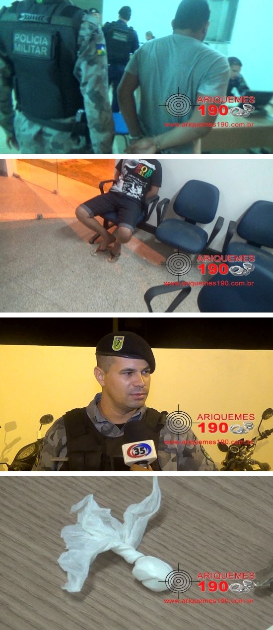 Durante a noite deste sábado 19/08, a guarnição da Polícia Militar realizava patrulhamento pela BR-421, quando em dado momento, dois suspeitos em uma moto escura com placa dobrada passaram pela guarnição. Os Militares deram ordem de parada a dupla que desobedeceu, foi feito um breve acompanhamento, sendo que ao abordar, a guarnição constatou que a motoneta da marca Honda, modelo Biz de cor preta, possui restrição de roubo/furto conforme o Boletim de Ocorrência Policial (BOP), sob n°136187/17. Com o infrator de 16 anos de idade, os Militares encontraram uma paranga contendo substância entorpecente aparentando ser cocaína, escondida na cueca. O elemento de 19 anos e o menor foram apresentados na Unidade Integrada de Segurança Pública (UNISP), onde foi registrado o Boletim de Ocorrência Policial (BOP) sob n°138617/17, para a tomada de providências.