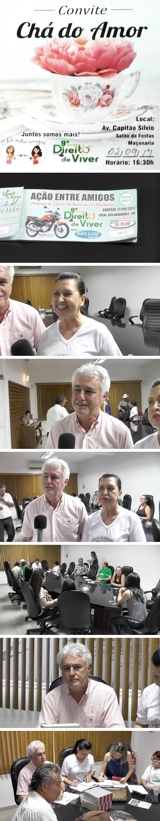 Todos os anos o Comitê da Solidariedade realiza diversos trabalhos em prol do Leilão Direito de Viver e este ano ficou ainda mais fácil a sua participação. Neste sábado 02/09, a partir das 16h30m, será realizado o Chá do Amor, a renda arrecadada com este chá será em prol do 9° Leilão Direito de Viver que acontecerá no dia 17/09. O presidente do comitê Aparecido José e a esposa Neuza, concederam entrevista ao Canal 35 para o Programa Bronca da Pesada fazendo o convite para toda a população. Neuza contou que durante o Chá do Amor, os participantes do evento vão prestigiar cantores regionais, duas apresentações de Dança com o Dr. Rodrigo e Camila, uma palestra que fala sobre o amor, sorteio de brindes, além de comes e bebes. O evento acontecerá na Loja Maçônica localizada na Av. Capitão Silvio e a entrada é apenas R$ 40,00 por pessoa. Além do Convite especial para o Chá, Aparecido também reforçou o convite para o Leilão Direito de Viver que acontecerá na Associação dos Pecuaristas de Ariquemes (APA) no dia 17/09 e quem quiser doar gado ou brindes, pode procurar uma loja parceira e fazer este grade gesto solidário.