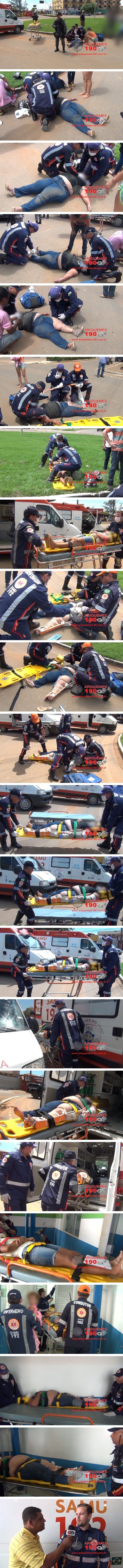 Na manhã desta quarta-feira 04/10, o Serviço de Atendimento Móvel de Urgência (SAMU), foi acionado a comparecer na rotatória das Avenidas JK com Jamari, onde havia acontecido um acidente de trânsito. Duas equipes se deslocaram para atender o acidente, sendo que ali chegando, populares informaram que a condutora da motoneta da marca Honda, modelo Biz de cor vermelha, ao realizar a rotatória, perdeu o controle da direção do veículo e caiu ao solo. Uma jovem de 19 anos sofreu escoriações, uma senhora sofreu possível fratura na perna e braço esquerdo, já a criança não ficou ferida. As vítimas foram imobilizadas e conduzidas ao pronto socorro para receber atendimento médico especializado. Em entrevista ao Canal 35 para o Programa Bronca da Pesada, o Doutor Fogaça relatou que a senhora reclamava de muita dor na coxa e braço esquerdo, onde possivelmente teve fraturas, contudo, as lesões não apresentavam riscos a vida da mesma.