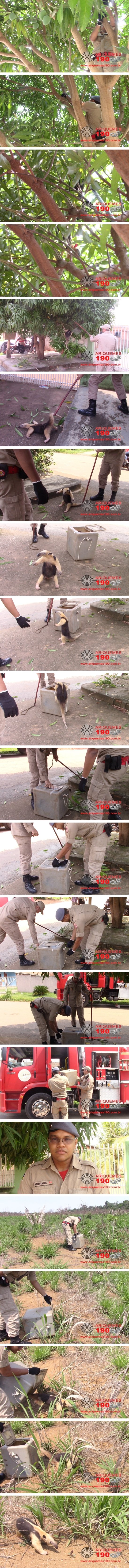 Na manhã desta terça-feira 17/10, a guarnição do Corpo de Bombeiros foi acionada a comparecer na Rua Suécia no Jardim Europa em Ariquemes, onde em cima de uma árvore, havia um Tamanduá. Imediatamente, o Sargento Junior e o Soldado Miranda fizeram o deslocamento, sendo que ali chegando, se depararam com o animal em cima da mangueira. O Bombeiro Miranda subiu na árvore onde fez com que o animal descesse e fosse capturado pelo Sargento Junior. O Tamanduá estava muito agressivo e deu trabalho para ser colocado na caixa apropriada para o transporte. Logo em seguida, o animal foi solto em uma área verde onde ficou em seu habitat natural. Em entrevista concedida ao Canal 35 para o Programa Bronca da Pesada, o Bombeiro Miranda recomendou a população que sempre que animais silvestres forem encontrados em área urbana, é necessário acionar o Corpo de Bombeiros para fazer a captura, preservando assim a integridade física dos cidadãos e do animal. Tamanduás são animais muito encontrados na região norte e pode oferecer risco a população, pois suas garras são muito fortes e afiadas causando perfurações profundas em vítimas atacadas.