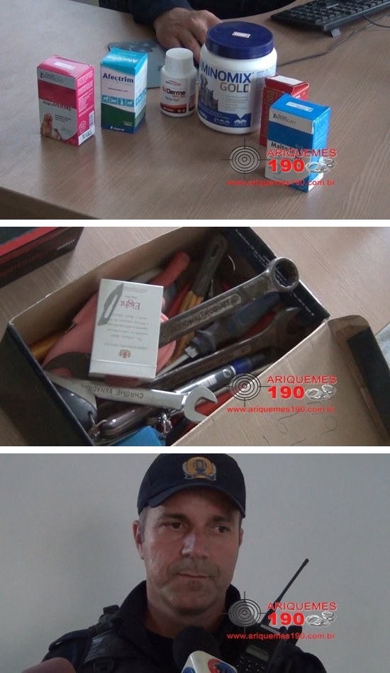 Por volta das 17 horas, desta quarta-feira 18/09, a guarnição da Polícia Militar realizava patrulhamento na Rua Bolívia no Setor 02 de Ariquemes, quando em dado momento, avistou um casal em atitude suspeita. Ao ser realizada a abordagem, os Militares localizaram com a dupla, alguns medicamentos veterinários e uma caixa de chaves. Sabendo de um furto que havia ocorrido em uma loja de produtos veterinários, os PM’s levaram os medicamentos até a empresa, onde o proprietário reconheceu como sendo os produtos de furto. Diante do exposto, o casal foi conduzido a Unidade Integrada de Segurança Pública (UNISP), onde foi registrado o Boletim de Ocorrência Policial (BOP), para a tomada das providências.
