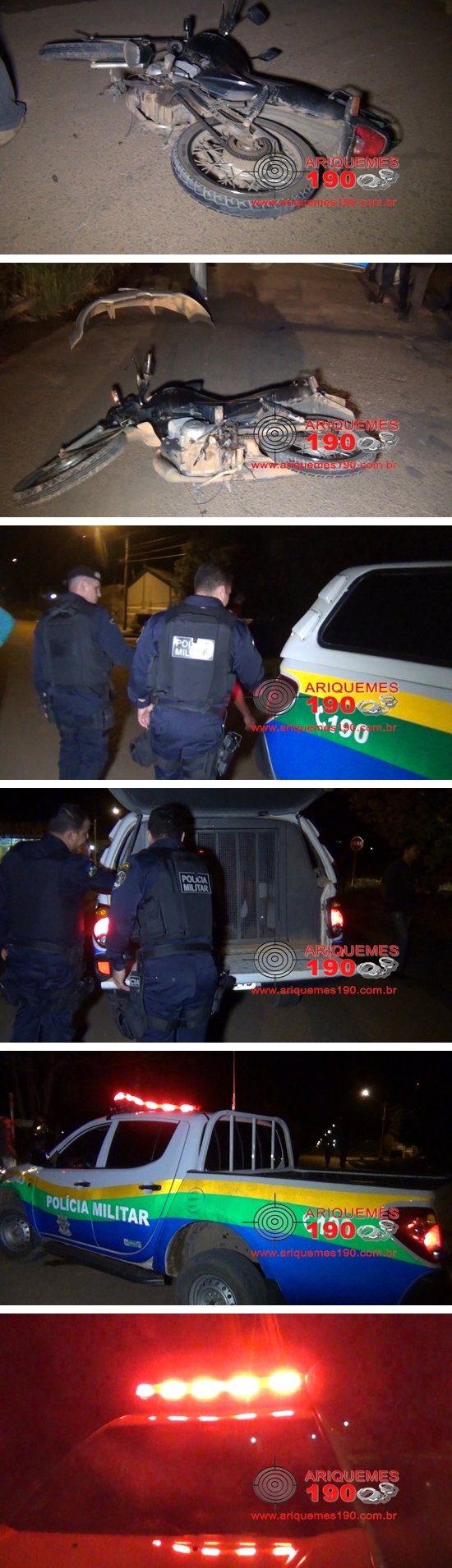 Por volta das 0h15m, desta quinta-feira 19/09, uma guarnição da Polícia Militar realizava patrulhamento pela Avenida Perimetral Leste no Bairro Parque das Gemas em Ariquemes, quando se deparou com um acidente de trânsito. Segundo populares, um carro da marca Ford, modelo Fiesta de cor prata transitava em alta velocidade, quando colidiu na traseira de uma motocicleta da marca Honda, modelo Fan de cor preta. O motociclista, imediatamente pulou do veículo, momento que o passageiro desceu do carro e o condutor acelerou o veículo e arrastou a moto por alguns metros. Em seguida, o condutor do carro se evadiu. O passageiro que ficou no local do acidente ainda fez menção estar armado para facilitar a fuga do amigo, contudo, populares notaram que o infrator não possuía arma e seguraram o mesmo até a chegada da PM. A informação do acidente foi passada para as demais guarnições em serviço, sendo que na Avenida Tucanos com a Avenida Rio Branco, o referido carro foi avistado por uma equipe de PM’s. Os Policiais deram ordem de parada ao condutor do veículo que empreendeu fuga em alta velocidade, contudo foi alcançado na Rua Humaitá Setor 09. O elemento estava em visível estado de embriaguez alcoólica, sendo que o mesmo foi conduzido ao Posto da Polícia Rodoviária Federal (PRF) onde o teste do bafômetro teve como resultado 1.24 mg/l. Diante do exposto, o condutor foi conduzido a Unidade Integrada de Segurança Pública (UNISP), onde foi registado o Boletim de Ocorrência Policial (BOP), sob n°177339/17, para a tomada das medidas cabíveis.