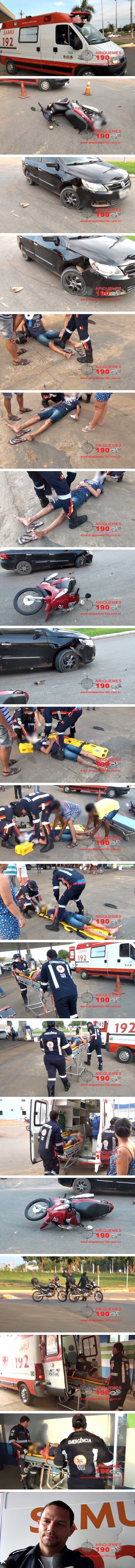 Por volta das 17h15m, desta sexta-feira 27/10, a equipe de socorro do Serviço de Atendimento Móvel de Urgência (SAMU), foi acionada a comparecer na Avenida Jaru, no Setor 03 de Ariquemes, para atender uma ocorrência de acidente de trânsito. Ali chegando, os socorristas se depararam com um jovem caído ao solo apresentando escoriações. Imediatamente, foi iniciado o atendimento pré-hospitalar. Segundo populares, o jovem conduzia uma moto da marca Honda, modelo Biz de cor vermelha, quando após a curva da Avenida Tancredo Neves com Avenida Jaru, veio a colidir na lateral de um carro que realizava o retorno. Com o impacto da colisão, o pneu da frente do carro chegou a estourar. Após ser imobilizado, o motociclista foi conduzido ao pronto socorro pare receber atendimento médico especializado.