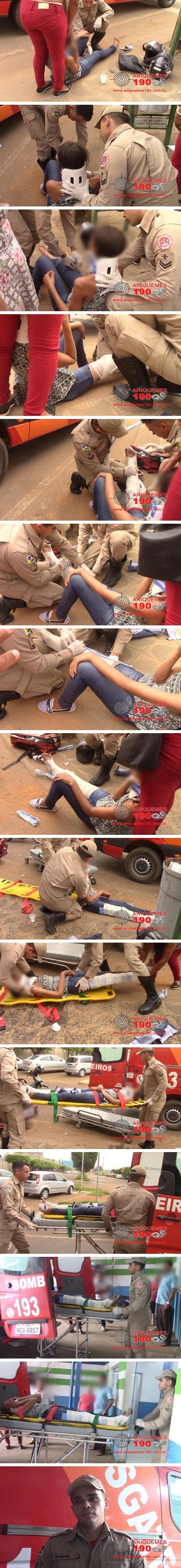 Durante a tarde desta quinta-feira 09/11, a guarnição do Corpo de Bombeiros foi acionada a comparecer na Avenida JK próximo a Avenida Canaã no centro de Ariquemes, para atender uma ocorrência de acidente de trânsito. Chegando ao local, o Cabo Wudarski e o Soldado M. Borges, se depararam com a vítima caída ao solo, apresentando escoriações e reclamando de fortes dores na perna. Populares relataram que no local, houve uma colisão entre duas motos. A vítima foi imobilizada, em seguida foi conduzida ao pronto socorro para receber atendimento médico especializado.