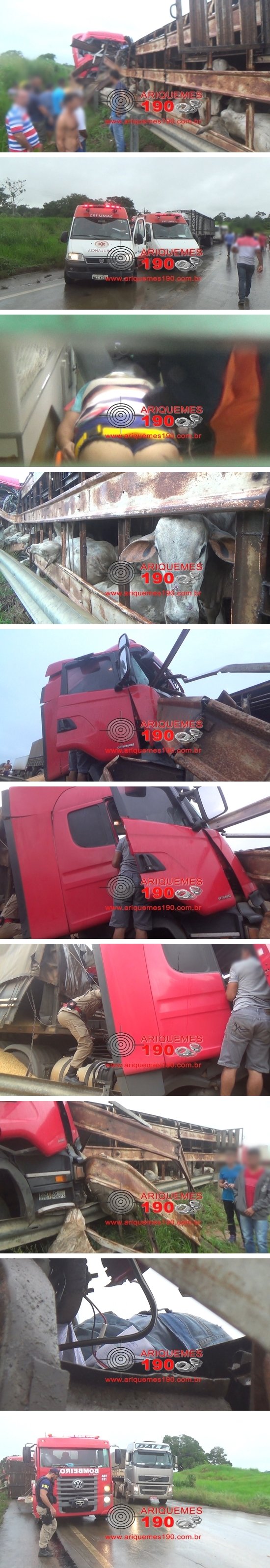 Informações ainda extraoficiais dão conta de que por volta das 13h50m desta terça-feira, 19/12, as Centrais de Operações do Corpo de Bombeiros e Serviço de Atendimento Móvel de Urgência (SAMU), assim como também a Polícia Rodoviária Federal (PRF), foram acionadas para atender uma ocorrência de acidente de trânsito ocorrido na Br-364 sentido Jaru, há aproximadamente 13 Km do município de Ariquemes, pois teria ocorrido uma colisão entre duas carretas. Imediatamente o Corpo de Bombeiros se deslocou com a viatura Auto Bomba Tanque (ABT) equipada com motor desencarcerador, pois havia informação de possível vítima presa em ferragens. Juntamente se deslocaram duas viaturas do SAMU, sendo a Unidade de Suporte Básico (USB) e a Unidade de Suporte Avançado (USA) e também uma viatura da PRF. Ali chegando, logo os socorristas se depararam com um homem identificado como Juvenal Pereira de Oliveira de 53 anos, condutor de uma das carretas, o qual já estava em óbito. No local também havia outras duas vítimas, sendo o condutor da outra carreta e uma mulher, ambos apresentavam ferimentos pelo corpo. Rapidamente foram iniciados os procedimentos de primeiros socorros às duas vítimas que foram transladadas pelas viaturas do SAMU para o Hospital Regional de Ariquemes, onde puderam passar por avaliação mais detalhada para averiguar a gravidade dos ferimentos. No local ainda não se sabe qual foi o motivo que ocasionou a colisão frontal das duas carretas. Apenas se sabe que a carreta Scania Bi trem de cor vermelha com placas de Cacoal/RO, que estava carregada com milho a granel seguia sentido Ariquemes e a carreta Scania/R124 de cor Branca com placas de Salto/SP, que estava carregada com animais bovinos seguia sentido Jaru. Vários animais foram mortos devido à violência do impacto.