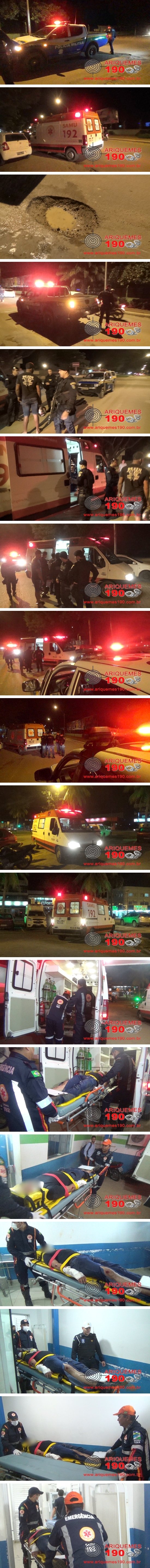Por volta das 20h15m desta quinta-feira, dia 04/01, uma equipe do Serviço de Atendimento Móvel de Urgência (SAMU) e a Polícia Militar foram acionadas a comparecer na Av. JK, próximo a creche Moranguinho em Ariquemes, pois no local haveria acontecido um acidente de trânsito. As equipes se deslocaram até o endereço citado, e ali chegando puderam verificar a veracidade das informações, encontrando a vítima, A.D.M. 27 anos, caído ao solo sentindo fortes dores no braço direito. Rapidamente a equipe do SAMU realizou os procedimentos de primeiros socorros à vítima, imobilizando a região do pulso direito, local onde possivelmente haveria uma fratura. Enquanto a equipe medica realizava os procedimentos, a guarnição da PM composta pelos Policiais: CB PM Monteiro, SD PM Donbroski e SD PM Cleberson, conversou com a vítima, a qual informou que trafegava pela Av. JK sentido Av. Jamari, com sua motocicleta, marca Honda, modelo CG 160cc, quando após passar pela lombada, acertou um buraco na via, perdendo o controle da direção do veículo, vindo a cair ao solo. A equipe do SAMU conduziu o homem até o Hospital Municipal de Ariquemes para que a vítima recebesse cuidados médicos especializados. A Polícia Militar colheu as informações para o registro da Ocorrência Policial de Acidente de Trânsito sob nº 2276/2018, sob responsabilidade da 1ª Delegacia de Polícia Civil de Ariquemes, para a tomada de posteriores providências cabíveis.