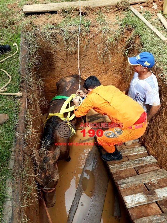 ARIQUEMES: Bombeiros resgatam égua que caiu em fossa em construção