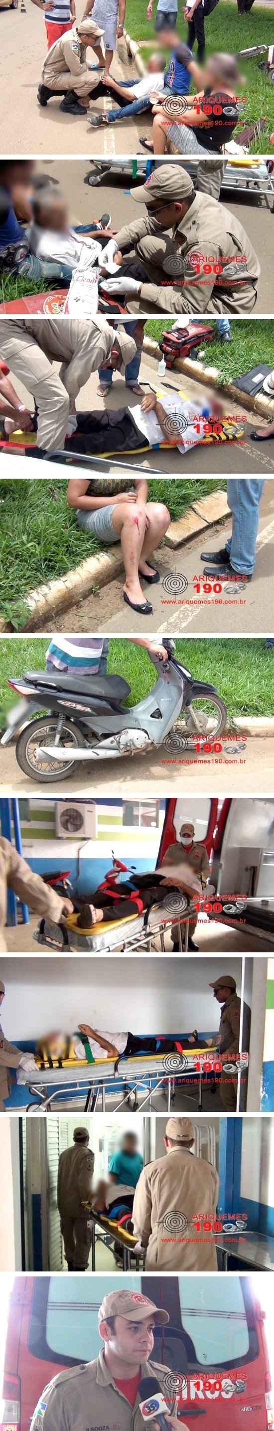 Por volta das 10 horas desta terça-feira (06/02), uma mulher pilotava uma motoneta Honda, modelo Biz 125 de cor preta, com placa de Ariquemes, pela Avenida Tabapuã, no Setor 03, no sentido Centro/Bairro, quando acabou se chocando com um idoso que desceu do canteiro e caminhava em direção à calçada. Com o choque os dois caíram ao solo e sofreram apenas escoriações leves, sendo que o idoso teve pequenas lesões no rosto e na mão direita, enquanto que a condutora da motoneta teve escoriações no joelho e no tornozelo da perna direita. O homem consciente foi conduzido ao Hospital Municipal de Pronto Atendimento pelo Cabo R. Souza e pelo Bombeiro Delfino e a mulher que estava bastante nervosa foi medicada no local do acidente e recusou condução ao Pronto Socorro. Policiais Militares a paisana que passavam pela Avenida no momento do acidente prestaram apoio às vítimas e aos Bombeiros.
