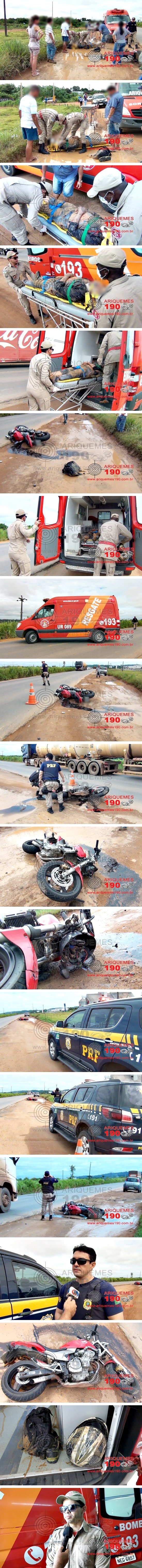 Por volta das 09 horas desta segunda-feira (12/02), o condutor de uma motocicleta da marca Honda, modelo Hornet 600 de cor vermelha, com placa de Porto Velho-RO, seguia pela BR-364, no sentido Ariquemes, quando o caminhão Mercedes Bens de cor azul, com carroceria de madeira que seguia a sua frente, entrou no Desvio, situado no Km-522, próximo ao Posto de Fiscalização da Polícia Rodoviária Federal e foi atingido na traseira pelo motoqueiro, que perdeu o controle do veículo e caiu dentro de uma poça de lama no acostamento. De imediato o motorista do caminhão parou e acionou uma equipe de socorristas do Corpo de Bombeiros, que conduziu a vítima ao Hospital Municipal de Pronto Atendimento com algumas escoriações pelo corpo e consciente. Uma guarnição da Polícia Rodoviária Federal balizou a via com cones, ficando o transito em meia pista, até que os Bombeiros concluíssem os trabalhos de resgate da vítima. Em seguida a pista foi liberada e o Boletim de Ocorrência de Acidente de Transito (BOAT) foi registrado pela PRF e apresentado ao plantão da Polícia Civil na UNISP.