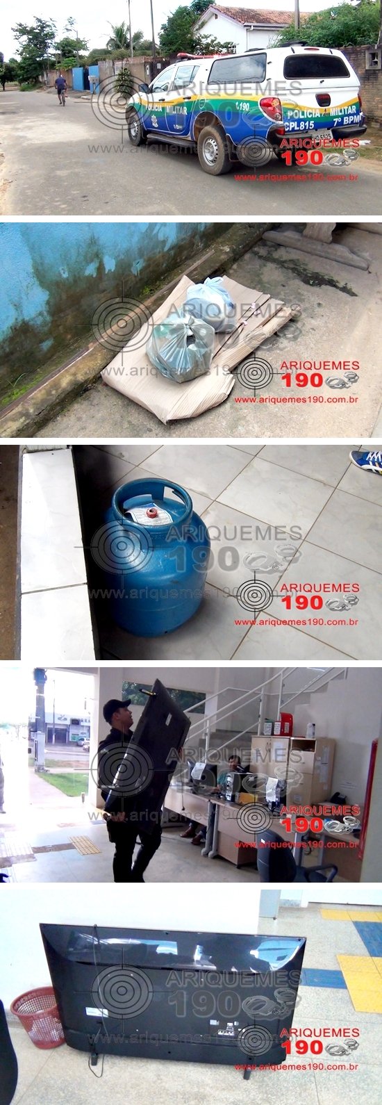 Durante a tarde desta segunda-feira 12/02, um Guarda Municipal que estava à paisana, transitava de bicicleta pela 8ª Rua do Setor 02, quando avistou um elemento suspeito carregando um televisor e outros objetos de procedência duvidosa. Imediatamente, o Guarda Municipal seguiu o elemento, que ao notar que estava sendo acompanhado, jogou o televisor junto com os objetos no quintal de uma residência no Apoio Social. Após abandonar os bens, o elemento fugiu tomando rumo ignorado. O Guarda acionou a Polícia Militar que compareceu no local e recuperou os objetos. A guarnição da PM juntamente com o Guarda Municipal se deslocou até a residência furtada, onde foi constatado que o elemento apenas tirou o portão do trilho e além dos objetos que estava levando, voltaria para pegar botijão e outras sacolas de objetos menores. Os bens furtados foram encaminhados a Unidade Integrada de Segurança Pública (UNISP), para que após o registro do Boletim de Ocorrência Policial (BOP), sejam devolvidos aos proprietários.