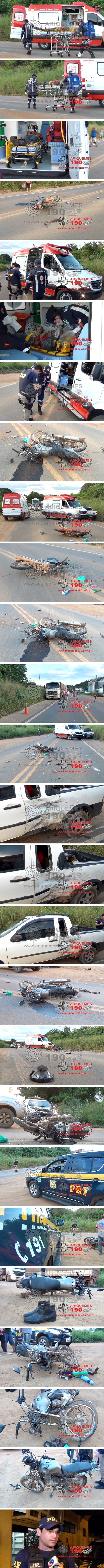 Por volta das 18 horas, desta segunda-feira 12/02, a equipe do Serviço de Atendimento Móvel de Urgência (SAMU), foi acionada a comparecer na BR-364 de Ariquemes sentido Jaru, onde próximo à entrada da RO-144, havia acontecido uma colisão entre uma moto e um carro. Ali chegando, os socorristas de depararam com a vítima caída ao solo apresentando escoriações. A Polícia Rodoviária Federal (PRF), também esteve no local, onde ao coletar os dados do ocorrido, os Policiais foram informados que o condutor da motocicleta da marca Honda, modelo Fan de cor prata, transitava pela BR sentido Jaru, quando o carro da marca Fiat, modelo Strada de cor branco, saiu da RO-144 e adentrou a BR. O Motociclista acabou colidindo transversalmente com o carro. Ambos os veículos tiveram avarias e a vítima foi encaminhada ao pronto socorro para receber atendimento médico especializado. A Polícia Rodoviária Federal (PRF) também realizou o teste do etilômetro em ambos os condutores com resultados negativos para a ingestão de bebidas alcoólicas.