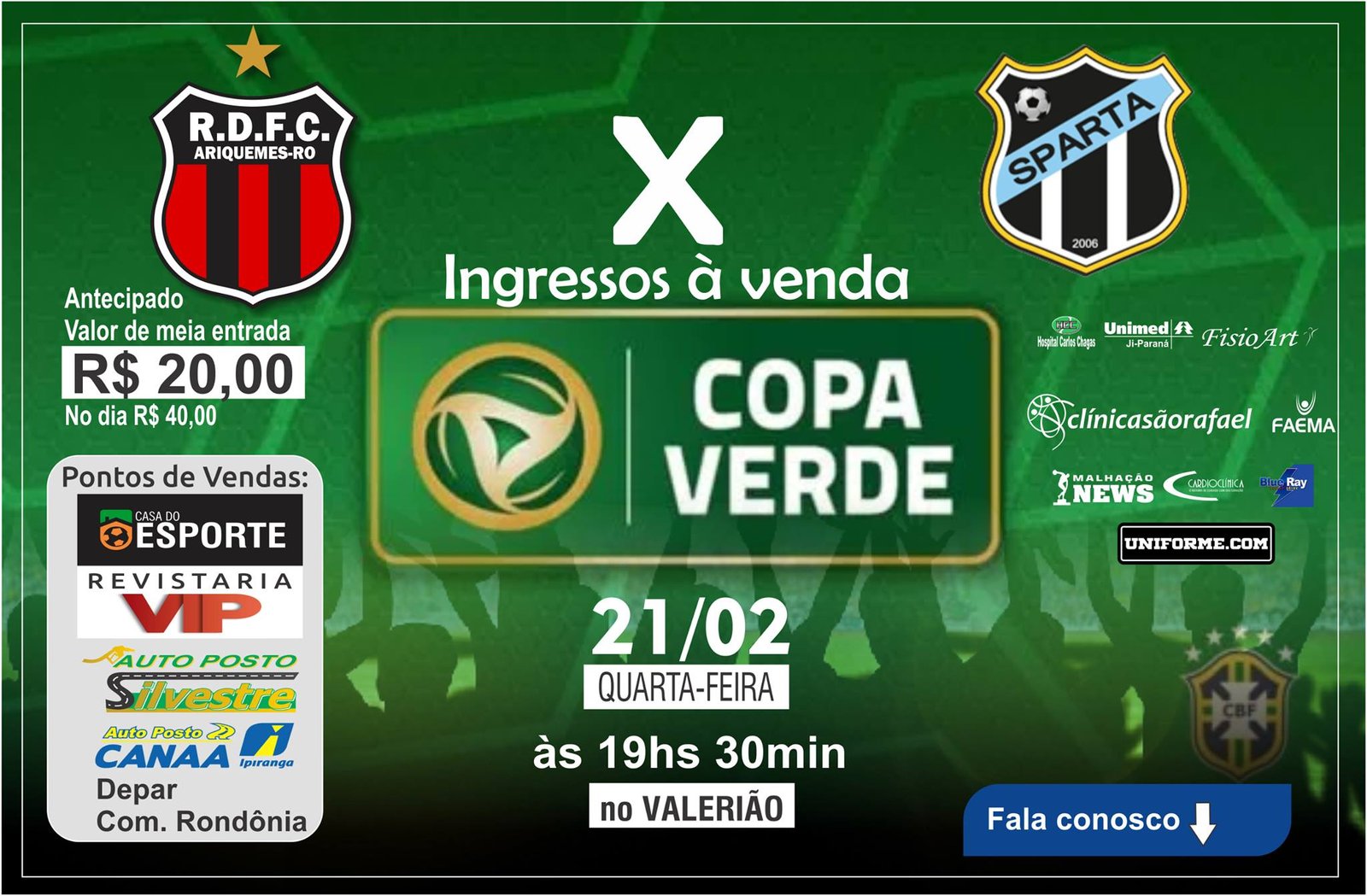 O Real Ariquemes e o Sparta de Tocantins vão disputar o jogo de volta da Copa Verde no dia 21 de fevereiro (quarta-feira), às 19h30 (horário de Rondônia), no estádio Gentil Valério, em Ariquemes. No dia 08/02, o Real Ariquemes ficou no empate com o Sparta em 1 a 1 no estádio Mirandão, em Araguaína-TO, pelo jogo de ida da primeira fase da Copa Verde 2018. Com o resultado, o Real Ariquemes precisa de um empate em 0 a 0 ou qualquer vitória para avançar à segunda fase. Já o Sparta-TO tem que vencer fora de casa ou mesmo empatar por três ou mais gols para chegar à fase seguinte. Caso ocorra novo empate em 1 a 1, o duelo será decidido nas cobranças de penalidade. Você não pode perder este grande jogo, nesta quarta-feira 21/02, a partir das 19h30, no Valerião. Ingressos antecipados por apenas R$ 20,00 nos pontos de venda: Auto Posto Silvestre, Revistaria Vip, Auto Posto Canaã, Depar, Comercial Rondônia e Casa do Esporte. No dia ingressos por R$ 40,00.
