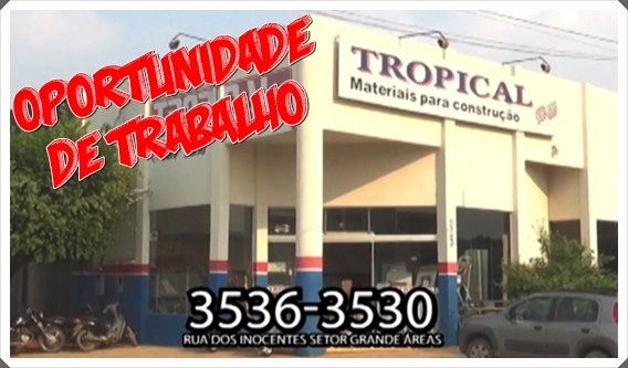 A Tropical Materiais para Construção está recebendo currículos para a seleção e posterior contratação de vendedores. Os interessados podem deixar curriculum na loja localizada na Rua dos Inocentes, Setor de Grandes Áreas, atrás do IG Shopping. Mais informações ligar 3536-3530.