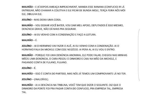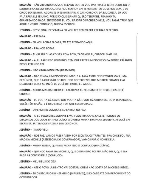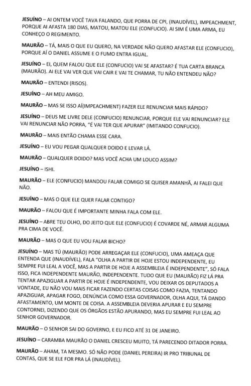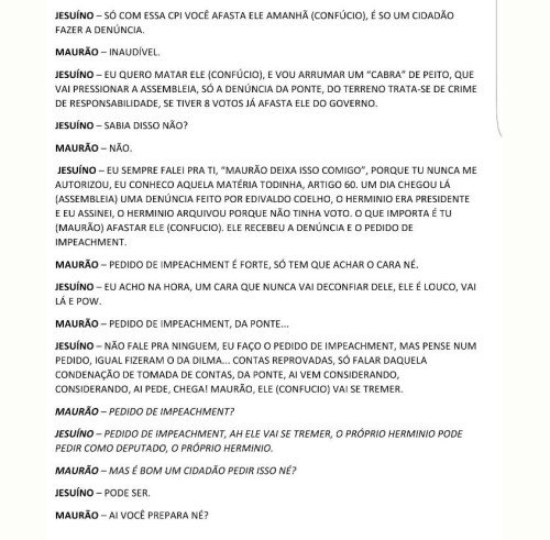 “Não fale pra ninguém. Eu faço o pedido de impeachment, mas pense num pedido igual fizeram o da Dilma…contas reprovadas, só falar daquela condenação de tomada de contas, da ponte, aí vem considerando, considerando, aí pede, chega! Maurão, ele (Confúcio) vai se tremer”, diz Jesuíno.