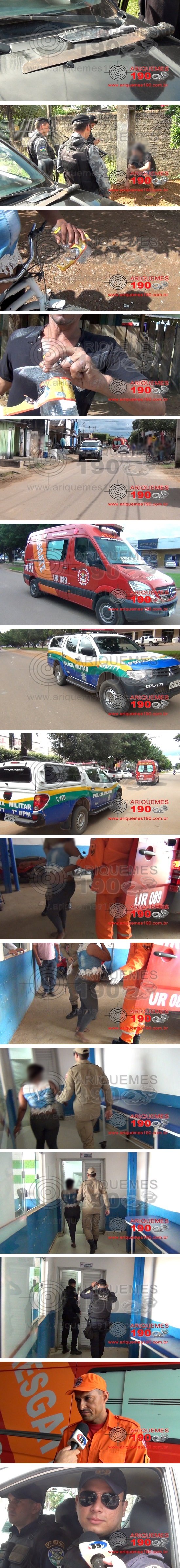 Por volta das 08 horas desta sexta-feira (06/04), populares que transitavam pela 12ª Rua do Setor 08 avistavam um casal em adiantado estado de embriagues discutindo fervorosamente em uma bicicleta, sendo que também era visível na garupeira da referida bicicleta, um facão e um cutelo (faca de lâmina retangular), que é utilizada para cortar carnes duras e ossos. A Central de Operações (C.O) foi informada via número de emergência 190 e de imediato enviou ao endereço indicado os Policiais Militares do Patrulhamento Tático Móvel (PATAMO): Vinícius e Amálio, comandados pelo Sargento Prudêncio, que abordaram o casal, apreenderam as armas brancas e por nenhum deles possuir Mandado de Prisão, foram liberados com a bicicleta e uma corotinha de pinga. Na sequência a guarnição do PATAMO foi solicitada a atender uma ocorrência de Furto na 6ª Rua ainda do Setor 08 e depois retornou ao patrulhamento ostensivo, momento em que populares que estavam na Rua Mário Quintana, no Setor 11, acionaram o Sargento André e o Cabo Wudarski, do Corpo de Bombeiros a prestar socorro a uma mulher que estava caída na rua com sangramento no nariz. Os Policiais Militares da Patrulha Delta: Cabo Jaderson e PM Frankciel foram ao local do chamado e prestaram apoio a equipe dos Bombeiros, que conduziu a mulher ao Hospital de Pronto Atendimento com o nariz quebrado, local onde foi reconhecida pelos Policiais como sendo a mulher que estava na bicicleta onde foram apreendidos a faca e o facão. Ela contou aos socorristas que o amásio dela, lhe agrediu usando um Soco Inglês e em seguida se evadiu do local tomando rumo ignorado. A mulher ficou no Pronto Socorro sob observação médica enquanto as guarnições de serviço realizavam diligências na tentativa de localizar o elemento.