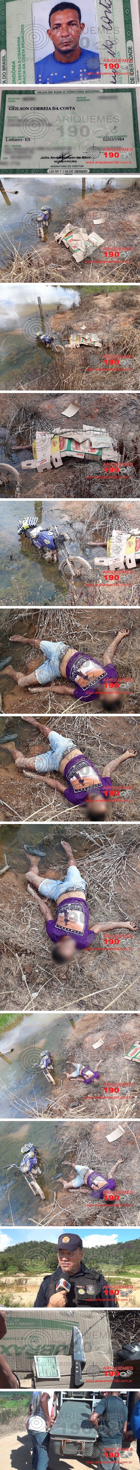 No início da manhã desta segunda-feira (09/04), o motorista do ônibus que faz o itinerário Ariquemes/Garimpo do Massangana, distante cerva de 50 quilômetros de Ariquemes pela Linha C-50 da BR-421, ao passar pela Vila da Serraria, avistou no lado direito da via, dentro da Grota do Azulão o corpo de um homem caído ao lado de uma motocicleta que estava parcialmente mergulhada e em pé dentro do brejo. Moradores da região entraram em contato com a Polícia Militar que enviou ao local o Sargento Araújo, o Sargento César e o PM Rambo, que após localizarem o corpo acionaram o Dr. Maylson e seu auxiliar e Policial Civil Paulo, que compareceram ao local do homicídio, acompanhados pelo Agente da Funerária Universo, Elias e pelo Motorista do Rabecão, Nilson. Trabalhadores da região contaram que a vítima Geílson Correia da Costa, de 34 anos, estava trabalhando no Garimpo há cerca de seis meses e era bastante responsável, pagando suas contas em dia, mas que depois que sua ex-esposa o largou e levou para a capital seus 05 filhos há pouco tempo, ficou transtornado e muito deprimido, faltando ao serviço e bebendo pelos bares da vila, sendo que no domingo (08/04), à noite, participou de uma festa em um dos bares do garimpo, até que tarde da noite pegou sua moto Honda CG Titan de cor azul, com placa de Ji-Paraná e saiu, até que perto das 23 horas foram ouvidos estampidos de 03 disparos de arma de fogo, mas por se tratar de um lugar muito escuro e perigoso, ninguém saiu para verificar o que tinha acontecido. O Perito Criminal Dr. Maylson localizou na nuca da vítima, uma perfuração provocada por um projétil que transfixou a cabeça e saiu um pouco abaixo do olho esquerdo. Uma equipe de Policiais Civil da Delegacia de Homicídios esteve na localidade coletando dados e lá mesmo iniciou as investigações para chegar ao autor do disparo, que possivelmente usou um revólver, pois nas imediações nenhum estojo deflagrado foi localizado. O corpo foi conduzido ao Instituto Médico Legal (IML) para a realização do Exame Tanatoscópico e a moto deixada no pátio da UNISP à disposição de seu verdadeiro proprietário. Mediante os fatos a ocorrência de Homicídio foi registrada na Delegacia de Repressão aos Crimes Contra a Vida em Ariquemes, que já está trabalhando no caso.