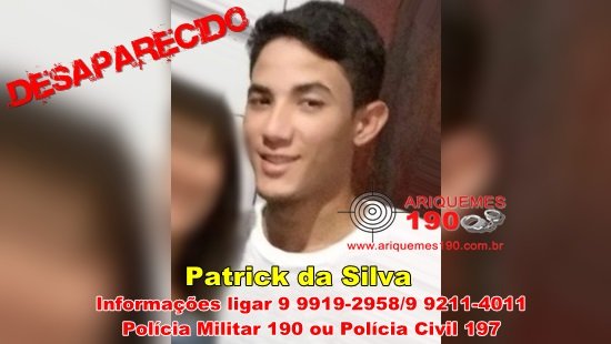 O jovem Patrick da Silva de 21 anos está desaparecido desde o último fim de semana, quando no sábado 14/04, foi visto pela última vez na residência onde mora localizada no Setor 04. No domingo, Patrick também esteve em uma lan house na Av. Canaã. A família pede a ajuda da população para localizar o rapaz, quem tiver informações pode ligar nos telefones 9 9919-2958/9 9211-4011, Polícia Militar 190 ou Polícia Civil 197.