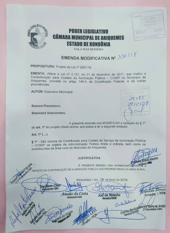 Diante desta situação inoportuna os vereadores fizeram um requerimento com a assinatura dos treze edis onde eles solicitaram a mudança da Lei, o Executivo mandou para o Poder Legislativo um Projeto de Lei, alterando esta Lei, contudo em seu conteúdo não havia a contemplação dos agricultores, diante disse os treze vereadores apresentaram uma emenda modificativa alterando a redação do Projeto e dando a isenção da taxa de iluminação pública para os agricultores do município de Ariquemes.