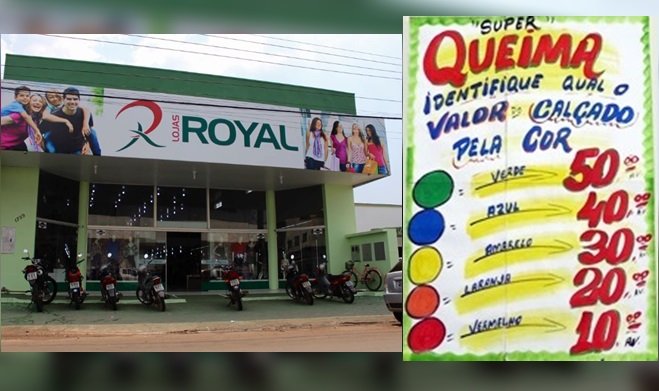 Já começou o grande queima de calçados da Lojas Royal na Alameda Piquiá. São centenas de pares de calçados para toda a família por apenas R$ 10,00, R$ 20,00, R$ 30,00, R$ 40,00 e R$ 50,00! Confira a cor da etiqueta e aproveite os precinhos especiais que a Royal preparou pra você. Corra antes que acabe. Lojas Royal, Alameda Piquiá centro.