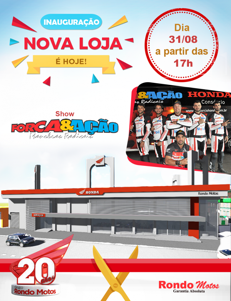 É hoje sexta-feira 31/08! Inauguração da NOVA LOJA Rondo Motos em Ariquemes. A partir das 17 horas e logo mais anoite o Grande Show de FORÇA & AÇÃO! Visite a Rondo Motos e faça bons negócios. Rua Fortaleza, 2052, Setor 1 - Ariquemes/RO