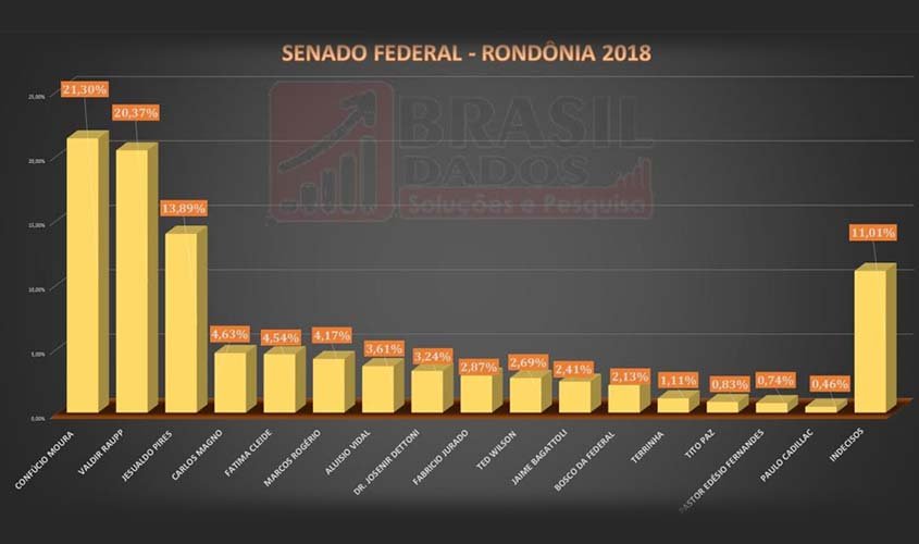 Faltando pouco mais de um mês para as eleições gerais , o senador Valdir Raupp e o ex-governador Confúcio Moura, ambos do MDB, aparecem tecnicamente empatados na pesquisa Brasil dados divulgada nesta segunda-feira.
