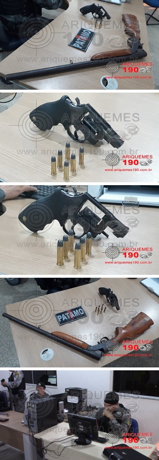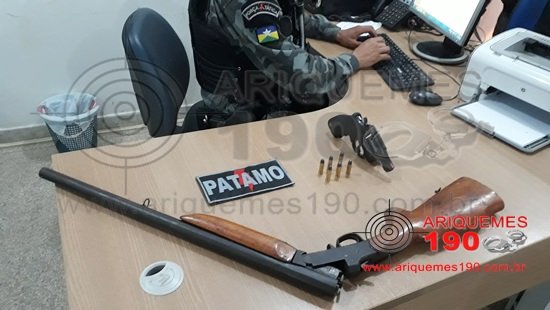 Na noite desta segunda-feira 01/10, as guarnições do Patrulhamento Tático Móvel (PATAMO), realizavam barreira na RO-257, quando em dado momento, deram ordem de parada a um motociclista. O condutor desobedeceu à ordem e adentrou uma residência repentinamente. Os Militares realizaram a abordagem do cidadão, sendo que com o mesmo nada de ilícito foi encontrado, porém, nas imediações, os Policiais localizaram um revólver calibre .38. Além do revólver, os Militares também apreenderam uma espingarda. As armas de fogo e o indivíduo foram apresentados na Unidade Integrada de Segurança Pública (UNISP), onde foi registrado o Boletim de Ocorrência Policial (BOP), para a tomada das providências.