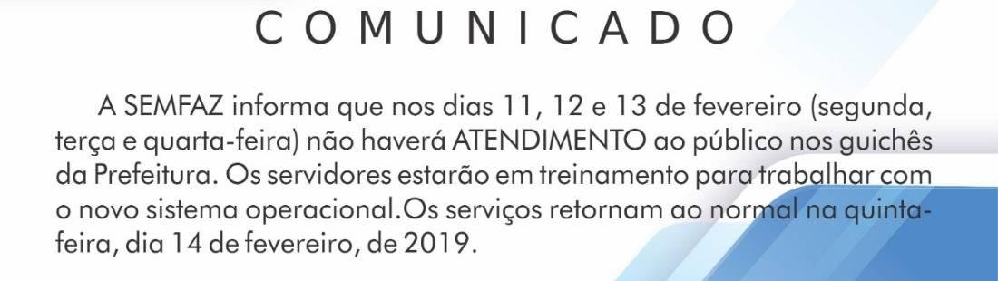 A SEMFAZ informa que nos dias 11, 12 e 13 de fevereiro (segunda, terça e quarta-feira) não haverá ATENDIMENTO ao público nos guichês da Prefeitura. Os servidores estarão em treinamento para trabalhar com o novo sistema operacional.