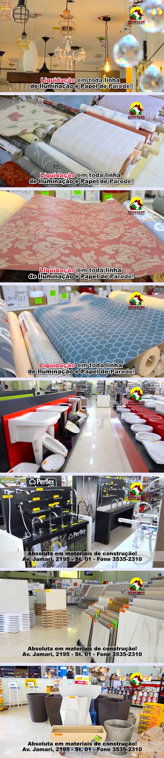 A Renascer também está com uma grande liquidação em toda linha de iluminação e papel de parede para deixar a sua casa ainda mais bonita. Renascer absoluta em materiais para construção. Avenida Jamari n° 2195, Setor 01 telefone 3535-2310.