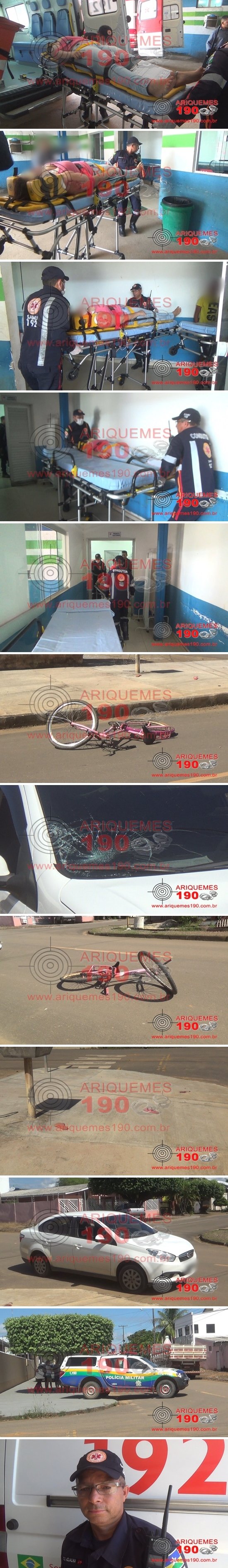 Já passavam poucos minutos das 14 horas deste sábado, 02/03, quando a Central do Serviço de Atendimento Móvel de Urgência (SAMU) foi acionada novamente para atender uma ocorrência de acidente de trânsito na Av. Quatro Cachoeiras com 12° Rua do Setor 03 em Ariquemes. Imediatamente uma equipe de socorristas composta pelo Técnico em Enfermagem Ademir e Condutor Adjalmo, se deslocaram na Unidade de Suporte Básico (USB) até o local indicado, onde ali chegando encontraram a vítima, uma mulher, caída ao solo apresentando algumas escoriações. Logo após os procedimentos de praxe a mulher foi encaminhada e entregue no pronto socorro do Hospital Regional para receber atendimento médico especializado. No local, populares relataram que a ciclista trafegava na Avenida juntamente com o veículo Siena de cor branco com placas de Ariquemes/RO, quando em determinado momento houve a colisão. Com o impacto, tanto a bicicleta como o para-brisas do carro ficaram avariados.