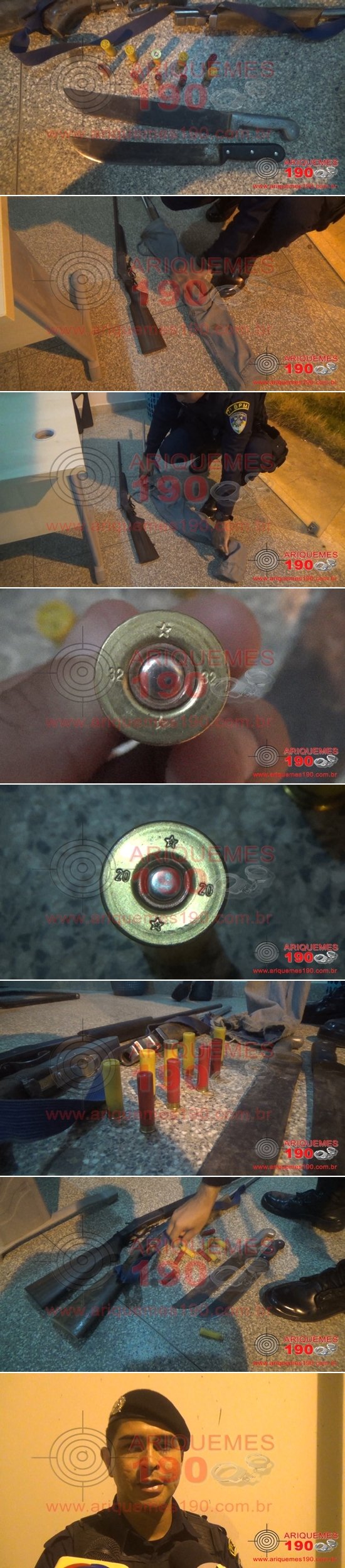Na madrugada deste domingo, dia 03/03 por volta da 01h 22min, o 1º Grupamento de Policiamento Ostensivo (GPPO) do distrito de Bom Futuro, recebeu uma ligação anônima de agricultores, os quais informavam que entre as linhas C-65 e C-70 no Travessão B-0, havia um veículo marca Fiat, modelo Pálio de cor preto com os vidros escuros e estava transitando em atitude suspeita. Diante dos fatos a guarnição imediatamente se deslocou até o referido endereço, e ali chegando avistou o tal veículo, onde fora dada ordem de parada, que foi obedecida. No carro estavam dois suspeitos: J.S.M. 23 anos e C.S. 62 anos, que autorizaram os Policiais a realizarem revista pessoal, onde nada fora encontrado. Já em revista ao interior do veículo, os Policiais encontraram duas espingardas, uma calibre .20 e outra .32, ambas desmuniciadas juntamente com dois facões, lanternas e 10 munições. Diante das constatações os suspeitos foram encaminhados até o 1º GPPO em Bom Futuro, onde o senhor C.S. 62 anos passou mal e teve que ser atendido pela equipe do Serviço de Atendimento Móvel de Urgência (SAMU). Após os procedimentos de praxe e consulta do veículo, os mesmos foram encaminhados até a UNISP do município de Ariquemes, onde foi realizado o registro do Boletim de Ocorrência Policial sob n° 39.162/2019, para que sejam tomadas as providências cabíveis ao fato.