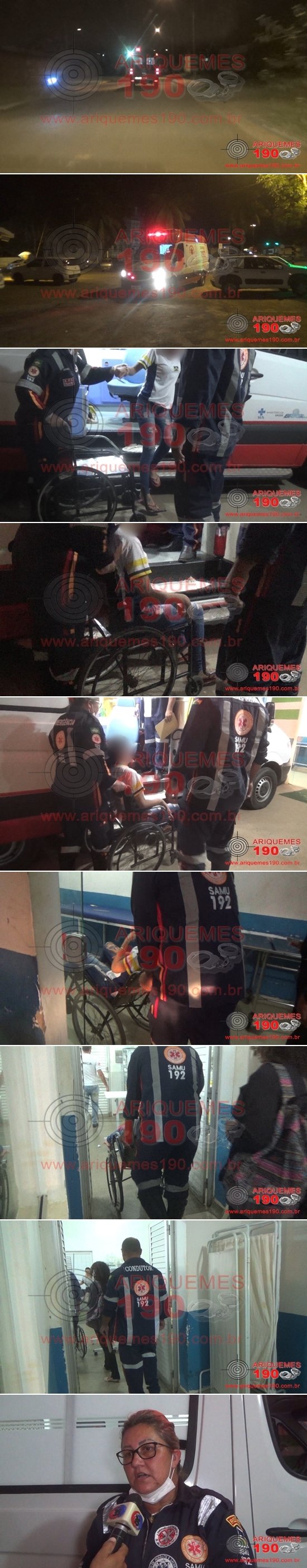 Nesta quinta-feira, 07/03 já por volta das 18h40, a Central do Serviço de Atendimento Móvel de Urgência (SAMU) recebera um chamado para atender um acidente na Av. Tucanos, Setor 09 de Cima em Ariquemes, onde uma grávida estaria ferida ao solo. Imediatamente a Unidade de Suporte Básico (USB) composta pelos socorristas Técnicos de Enfermagem Wesley e Simone, e Condutor Volnei, se deslocou ao local indicado, onde ali chegando encontrou a vítima, uma mulher grávida de quatro meses, que já estava sentada na lateral da via. A vítima foi avaliada preliminarmente pela equipe e não foi visualizada nenhuma fratura ou escoriação aparente, contudo a grávida relatou dores pélvicas devido ao momento da queda ter caído ao solo com a barriga para baixo. De pronto foram realizados os procedimentos de primeiros socorros necessários e posteriormente a vítima foi conduzida ao Hospital Regional para receber atendimento médico especializado. Ao conceder entrevista à equipe de reportagens do site Ariquemes190 e Canal 35.1 Digital, A Técnica Simone informou que segundo populares que visualizaram o acidente, a colisão teria sido entre duas motocicletas, ambas com condutores e passageiros, contudo apenas a grávida necessitou de atendimento médico, sendo que os demais envolvidos saíram ilesos.