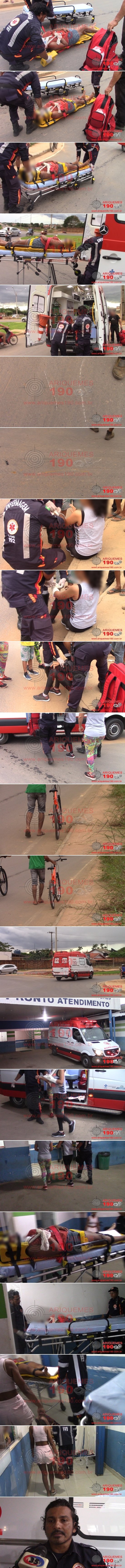 Aproximadamente por volta das 15 horas de sábado, 16/03, uma garota transitava pela Av. Tancredo Neves para convergir para a Av. Hugo Frey com sua bicicleta Mountain Bike de cor laranja, momento em que também trafegava uma jovem em sua motocicleta na mesma via, quando na rotatória houve a colisão. Uma equipe do Serviço de Atendimento Móvel de Urgência (SAMU) foi acionada por populares que ali estavam e rapidamente se apresentou ao local na Unidade de Suporte Básico (USB), composta pelos socorristas: Técnico de Enfermagem Gener e Condutor Adjalmo, onde de imediato já iniciou o atendimento de primeiros socorros às vítimas. Ao conceder entrevista à equipe de reportagens do site Ariquemes190 e Canal 35.1 Digital, Gener relatou que quando chegaram no local as vítimas já estavam sentadas, a condutora da moto estava no meio da pista e reclamava de muitas dores na região da clavícula lado direito. Já a condutora da bicicleta estava à margem da via e também se queixava de dores no punho direito. Ambas as mulheres foram encaminhadas ao Pronto Socorro do Hospital Regional para receberem atendimento médico especializado e melhor avaliação com exames de imagens.