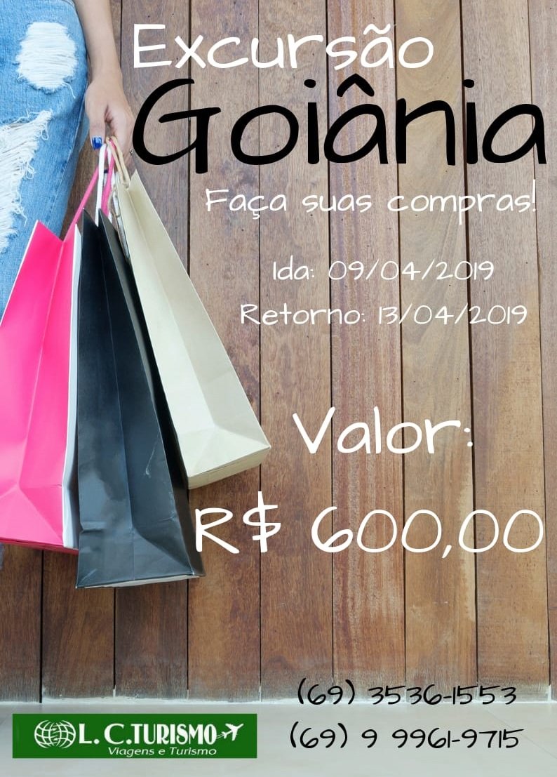 Atenção lojistas! A LC Turismo irá realizar uma excursão para Goiânia saindo dia 09/04 e voltando dia 13/04, por apenas R$ 600,00 por pessoa. Reserve já a sua vaga na LC Turismo. Telefone 3536-1553. Anexa ao terminal rodoviário.