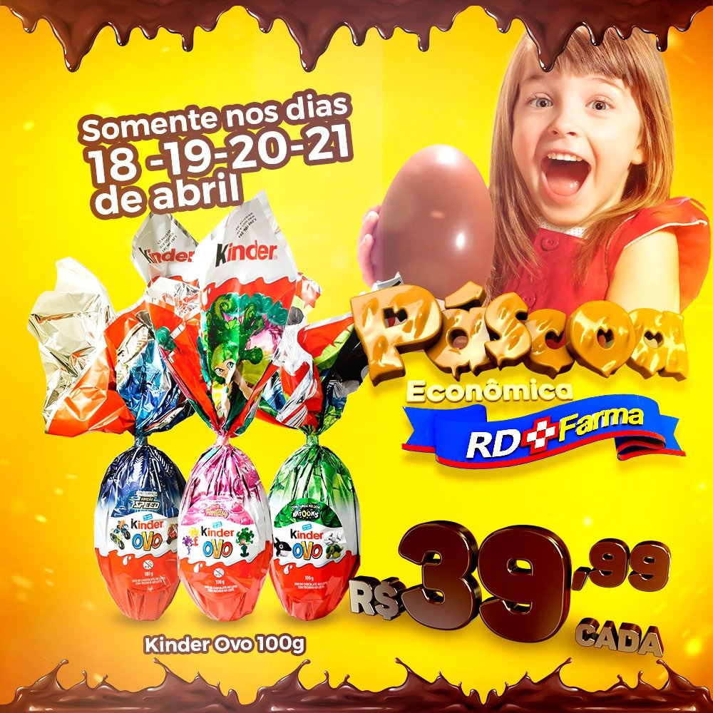 Saboreie essa páscoa com as promoções da RD Farma! Isso mesmo, a RD Farma oferece deliciosos ovos Kinder 100g por apenas R$ 39,90. Compre pra toda família na RD Farma localizada na Avenida Tancredo Neves no centro. RD Farma saúde e bem estar.