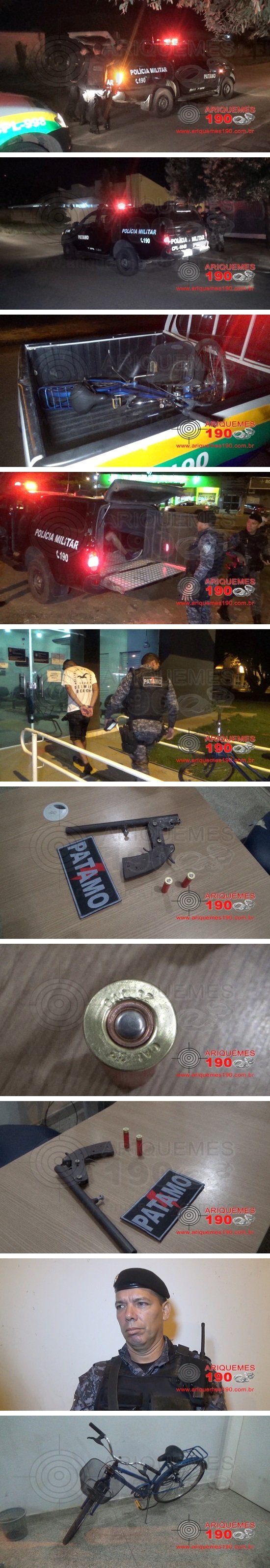 Na noite deste sábado 20/04, a guarnição de Patrulhamento Tático Móvel (PATAMO) realizava diligências pelo Setor 05, quando os Militares foram abordados por um cidadão relatando que um elemento em uma bicicleta estaria armando tentando realizar roubos. A guarnição fez buscas e abordou o indivíduo na Rua São Paulo, onde ao dar ordem de parada, o sujeito se jogou no chão. Em revista pessoal, foi encontrada uma arma de fogo de fabricação caseira com duas munições. Ao ser indagado, o indivíduo identificado como sendo Pablo Mikael Raika Souza Santos de 23 anos, assumiu que estava no albergue, quando teve o benefício da saída temporária de páscoa e realizaria o roubo de um aparelho celular. Diante do exposto, o criminoso foi conduzido e apresentado na Unidade Integrada de Segurança Pública (UNISP) onde foi registrado o Boletim de Ocorrência Policial (BOP) para a tomada das providências. Pablo foi preso há poucos meses quando foi atingido com um tiro na nádega ao trocar tiros com a Polícia no Setor 06.